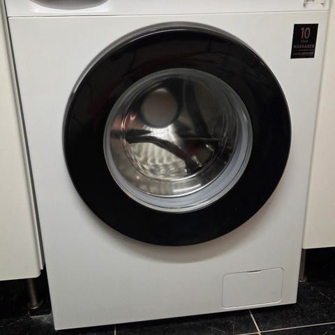 Notera att det är skruvhål på ovansidan tvättmaskinen. Skruvhålen är där eftersom en torktumlare stått ovanpå och därmed har en staplingsbricka varit mellan maskinerna.