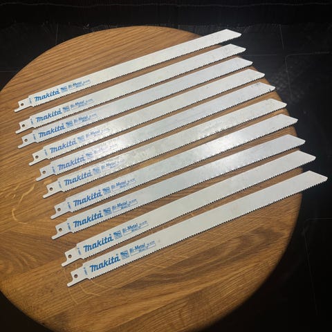 Milwaukee och Bosch sågblad set med olika längder och tandstorlekar, lämpliga för sågning i trä och metall. Setet innehåller flera blad av varierande storlek och modell, inklusive Milwaukee Heavy Wood och Bosch Carbide Technology. Bladen är tillverkade av metall och är avsedda för användning med sticksågar.