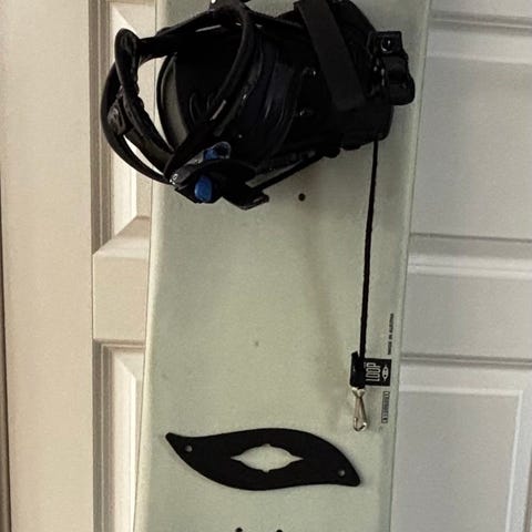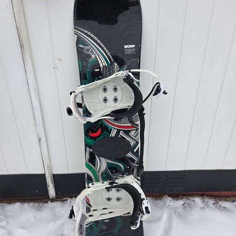 Never snowboard med bindningar i röd och vit färg. Snowboarden är utrustad med fästen för att fästa bindningar och är avsedd för vintersport.