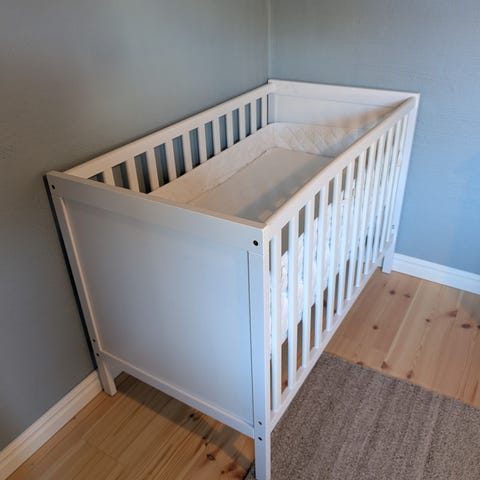 Vit spjälsäng från Kaxholmens Sängfabrik bortskänkes mot avhämtning. Spjälsängen är nedmonterad och enkel att transportera.