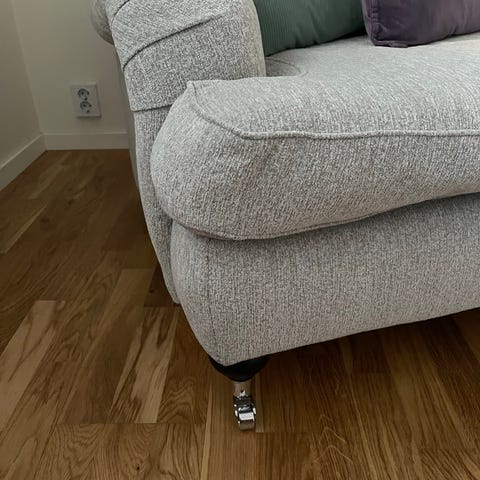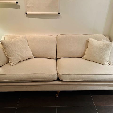 Mio soffa i beige tyg med mjuka dynor och rundade armstöd. Soffan har hjul med guldfärgad detalj för enkel förflyttning. Passar för vardagsrum och erbjuder komfort och funktionalitet.