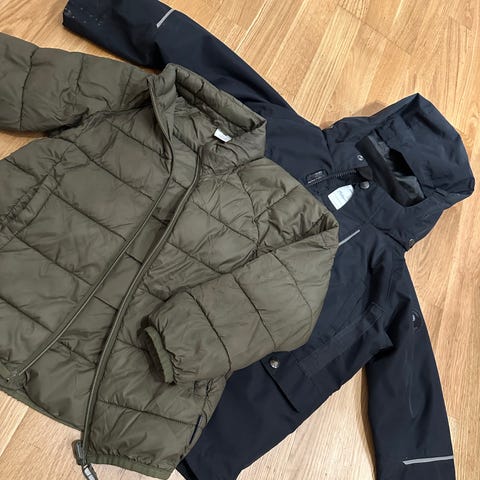 Ett set med två jackor från Polarn O. Pyret. Den ena jackan är en vadderad jacka i olivgrönt, och den andra är en svart skaljacka med huva och reflexdetaljer.