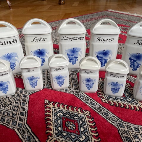 5 stycken kryddburkar i porslin. 5 cm x 4,5 cm. Höjd ca 10 cm. 100 kr för alla 5. Kan skickas.