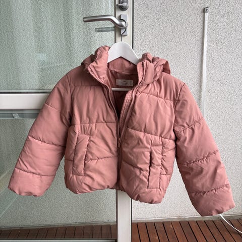 Vadderad jacka med luva. Jackan har dragkedja fram och två fickor.