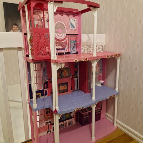 Säljer vår dotters Barbie dockhus, leksakshus med fler våningar, hiss och möbler inklusive badkar, kylskåp och köksutrustning.