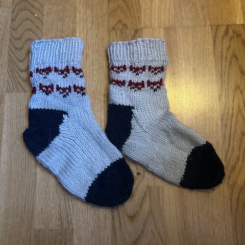 Fina stickade strumpor som tyvärr blivit för små. Uppskattar att strumporna skulle passa barn mellan 2-4 år.