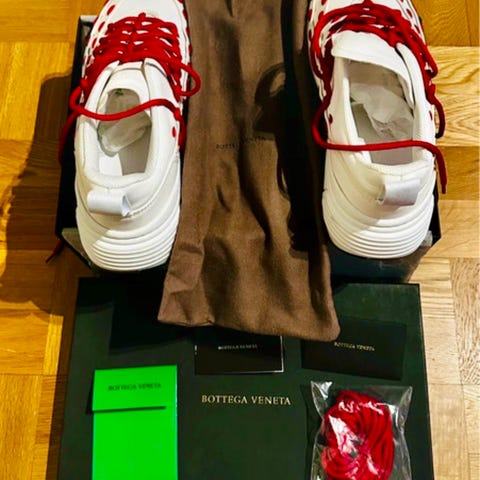 Slip-on skor i beige mocka med flätad design och vit sula. Skorna är utan snörning och har en låg profil, lämpliga för vardagligt bruk. Storlek 43. Nypris: 12400 sek