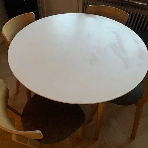 Bordet har lite färgstänk med tex rosa målarfärg: detta kan enkelt målas över med vit färg.