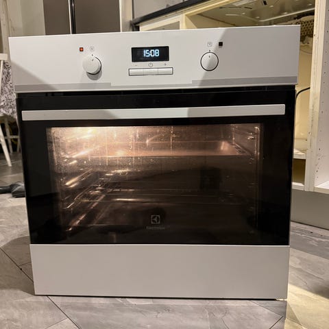 Varmluftsugn för inbyggnad i 60-skåp. Funkar perfekt men listen mot luckan är lite lös. Se bild.