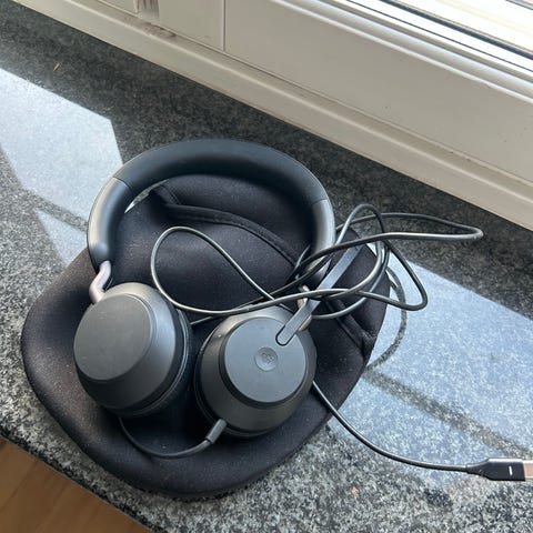 Jabra hörlurar med mikrofon, levereras med en skyddande väska. Hörlurarna har en justerbar bygel och en anslutningskabel med inbyggd mikrofon. Färg: svart med röda detaljer.