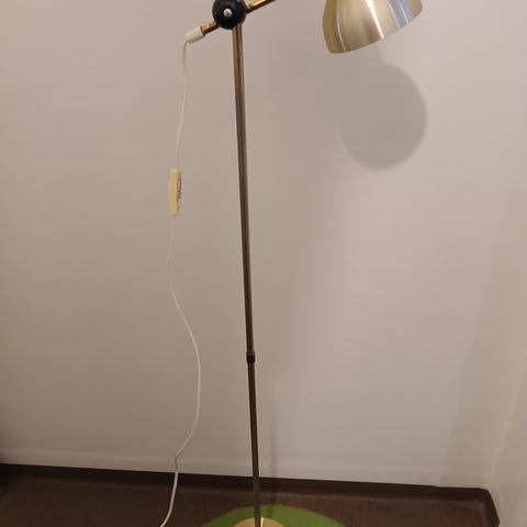 Golvlampa med vit veckad lampskärm och mässingsstomme. Går att justera i höjdled och lamparmen är böjbar.