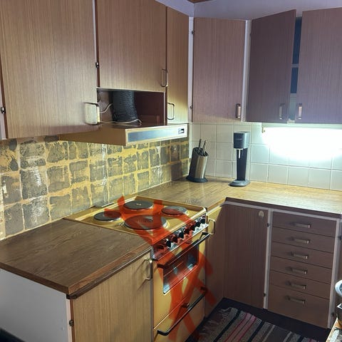 Köket är i bra skick med frontdelar i massiv ask. Passar perfekt till sommarstuga eller gäststuga.