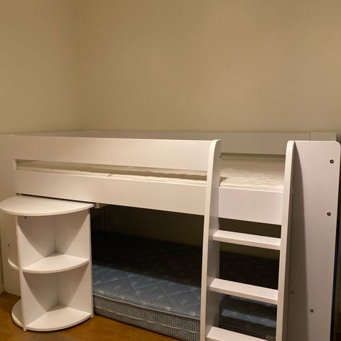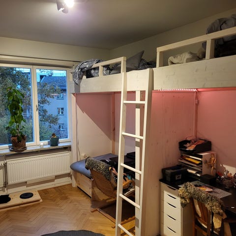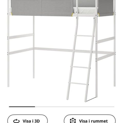 Loftsäng SAGA från Svenska hem, passar madrass 120x200cm. Total höjden är 190cm, under sängen är höjden 146cm som passar perfekt till att ha en soffa eller skrivbord under.