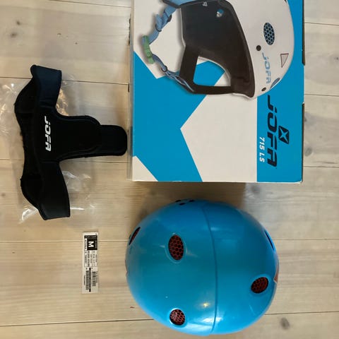 Jofa hjälm i tre olika färger: blå, svart och vit. Hjälmen har ventilationshål och justerbara remmar för säker passform. Inredningen är vadderad för komfort och skydd vid användning.