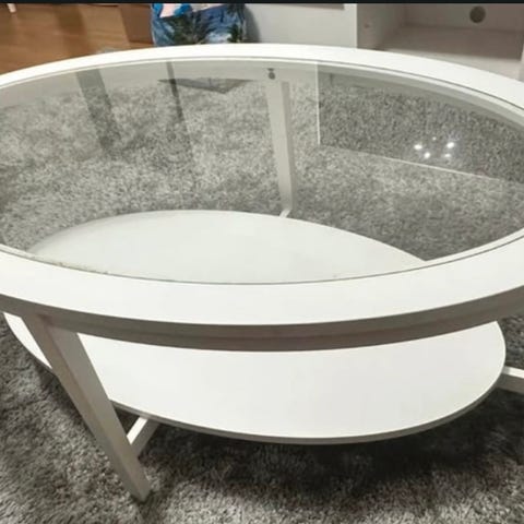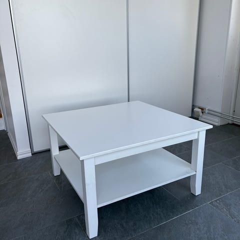 IKEA soffbord i vitt med rektangulär form och en hylla under bordsskivan. Bordet har mindre märken och skador på ytan och kanten.