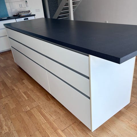 Köksbord i vitt trä med en öppen hylla under bordsskivan. Bordet har en slät yta med några synliga märken och fläckar. Passar för köks- eller matplatsanvändning och erbjuder förvaringsutrymme på hyllan för mindre köksapparater eller tillbehör.