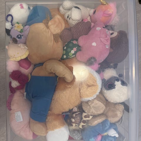EN låda med diverse gosedjur och annat .