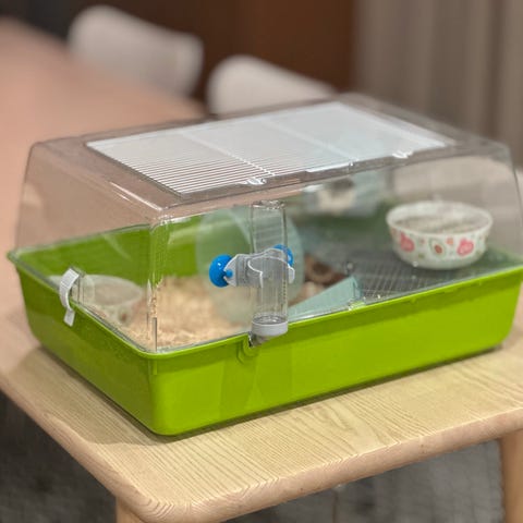 Torpac hamsterbur med blå plastbotten och svart galler. Burens övre del är transparent med flera anslutningar för plasttunnlar. Inkluderar plasttunnlar, en stege och tillbehör för smådjur. Burens storlek och material gör den lämplig för hamstrar och andra små gnagare.Mycket fin, finns i Ullared
