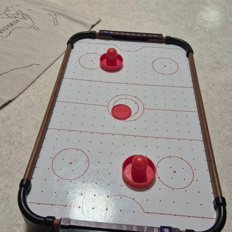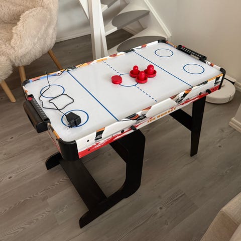 Bordsairhockeyspel med spelplan i vitt och röda puckar och skyfflar.