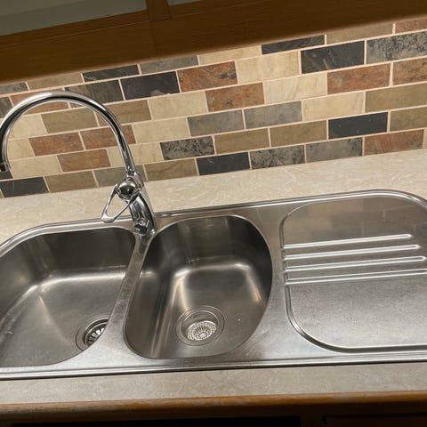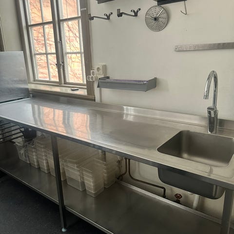 Rostfri diskbänk med dubbelho. Passar för installation i kök. Materialet är rostfritt stål, vilket ger hållbarhet och enkel rengöring.