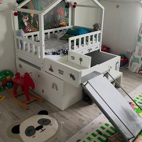 Sängen är byggd och alla dela är inköpta, ni får hjälp att montera ner den. 4 förvaringslådor under sängen samt rutchkana. Resåbotten ingår ej. Men får plats en 90x200 säng plus bäddmadrass. Den har varit otroligt uppskattad utav barnet. En del färgskav som är enkla att fylla i men inget krav då den fungerar felfritt.
