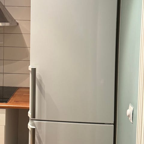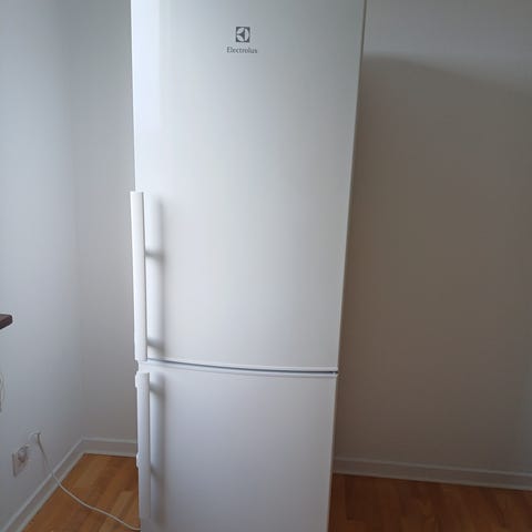 Electrolux kombiskåp med kyl- och frysfack. Vit färg och standardstorlek. Utrustad med flera hyllor och fryslådor för förvaring av matvaror.