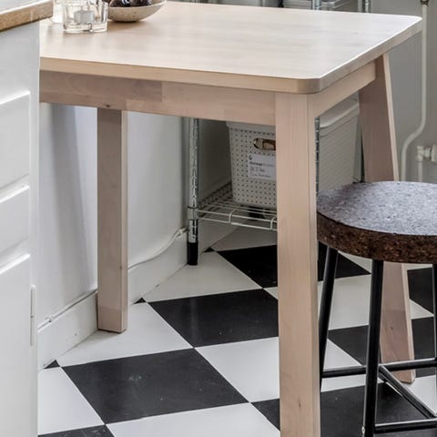 IKEA bord med fyrkantig bordsskiva i ljust trä och vita ben i trämaterial. Bordet har en enkel och funktionell design som passar i olika rum och miljöer.