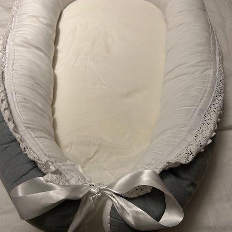 Babynest, baby myspöl, babybjörn bärsele och oanvänd sänghimmel med stativ som man sätter fast på spjälsäng.