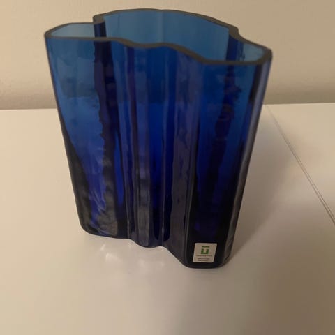 Iittala Alvar Aalto vas, 160 mm hög i blått glas. Vasens design kännetecknas av dess organiska, vågformade konturer. Passar för dekoration och blomsterarrangemang. Fint skick.