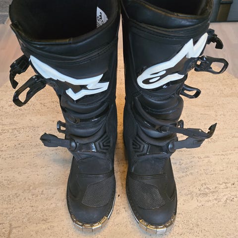 X-Moto Crossstövlar i svart färg. Stövlarna har spännen för justering och är avsedda för motocrossanvändning. Materialet är robust och designen inkluderar förstärkningar för skydd vid terrängkörning. Oanvända cross stövlar, storlek 44, finns i Ullared