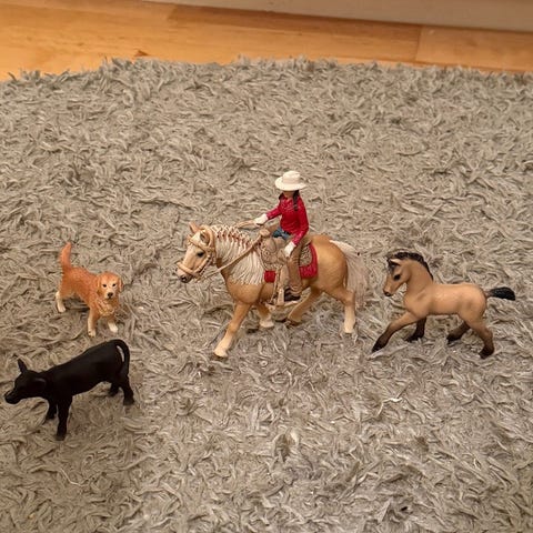 Schleich spolspilta inklusive en häst, en figur och andra tillbehör som visas på bilderna. Skriv vid frågor eller intresse!
