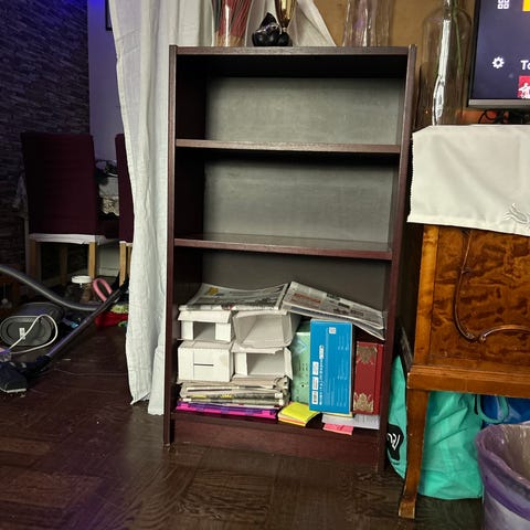 Fin vit hylla från IKEA med 2 röda lådor. Finns ett märke på ytan, annars i bra skick!