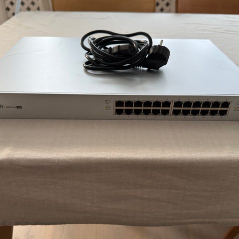 Ubiquiti UniFi nätverksswitch med flera portar för nätverksanslutning. Enheten är designad för rackmontering och har en metallkonstruktion i silverfärg. Passar för nätverksinfrastruktur i olika miljöer.