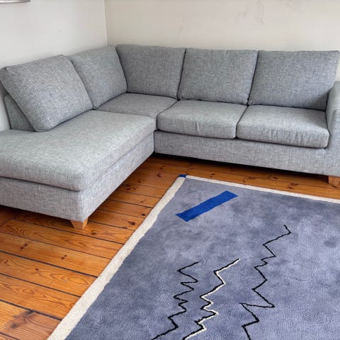 Den sälja begagnas, absolut använd, lite fläckar men syns inte så mycket eftersom tyget är ganska melerade. Går att ta bort tyget på alla kuddar och tvätta.