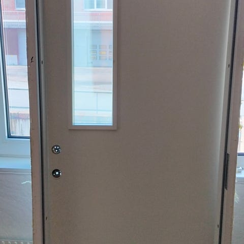 Populära Swedoor innerdörr med slät vit yta, utrustad med rostfritt dörrhandtag och lås. Dörren är av standardstorlek och avsedd för inomhusbruk. Modellen heter ’Easy’ och är tidlös, elegant och populär. Handtagen och låsen är av modellen ’Stockholm’ och passar mycket bra med modern inredning.