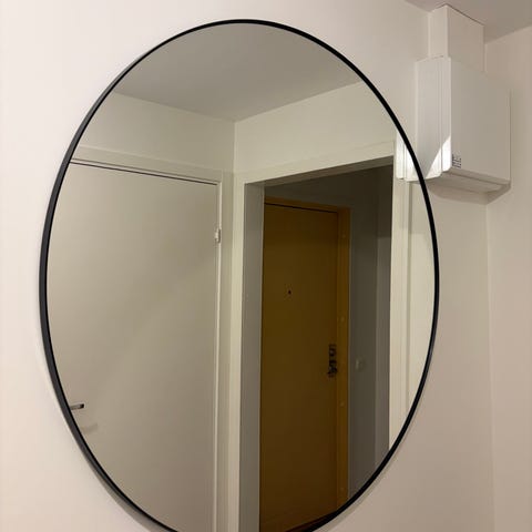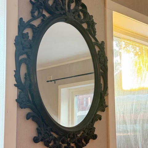 En helkroppsspegel med brun ram i trä till salu. Mått ca 1,65 x 0,75 m. Finns i Karlskrona, kan köras ut i närheten om överenskommet.
