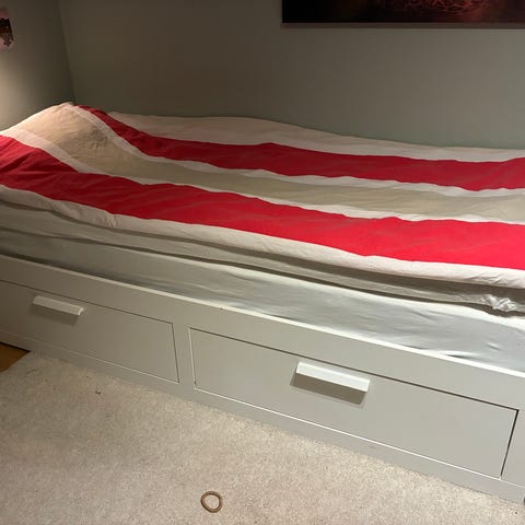 Säljer min dotters brimnes från IKEA. Det har suttit en ljuslist på gaveln, pilla bort eller sätt dit en ny. Pris 300 kr p g a detta samt att den har några år på nacken.