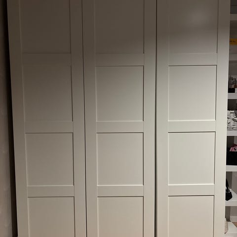 En stor garderob fördelad på 1st 1 meters med spegeldörrar och 2 st 50cm med vita dörrar. Nypris är ca 9000kr