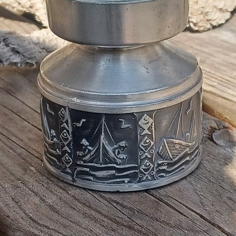 Fin gammal ljusstake i tenn, 14 cm diameter och 5 cm höjd, flera stämplar finns ovanpå och under.