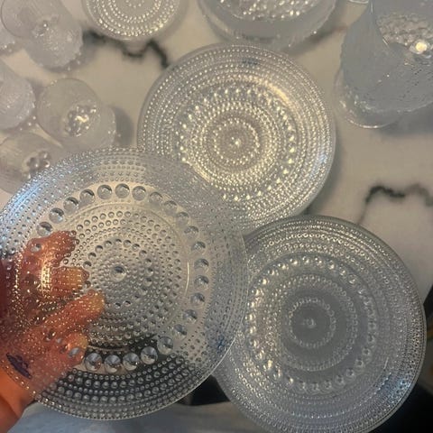 Iittala glasfat med dekorativa mönster runt kanten. Tillverkat av klart glas och har en rund form. Passar för servering eller som dekorativt föremål.