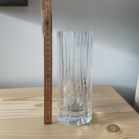 Vasens form är rektangulär med en klar bas och dekorativa svarta ränder. Passar för blomsterarrangemang och som dekorativ inredningsdetalj.