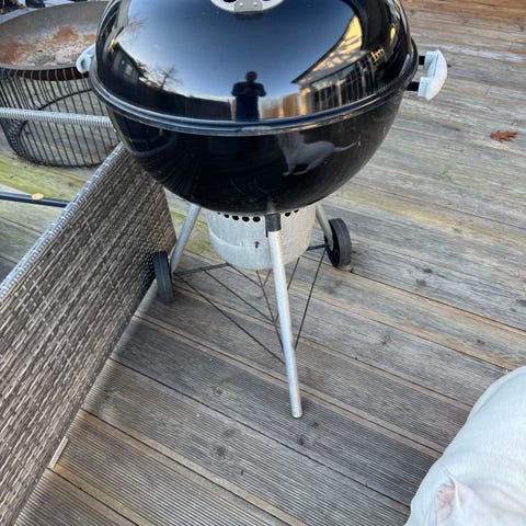 Weber Kettle Grill kolgrill med rund form och svart färg. Utrustad med ventilationsöppningar och handtag i trä på locket. Passar för utomhusbruk och kol som bränsle.