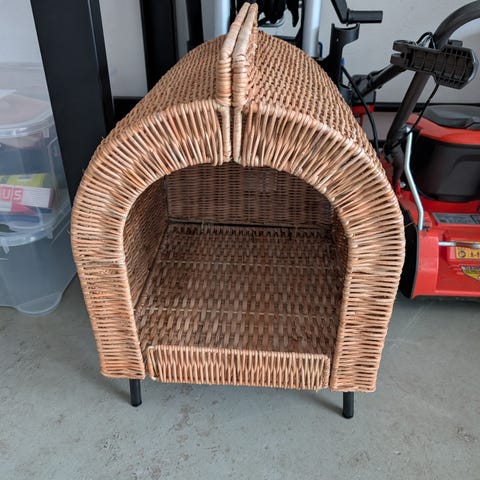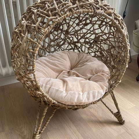 Säljer vår kattbädd i flätad pil, den har två bäddar med tillhörande kuddar till. Inga skador. Mått 54 × 43 × 37 cm