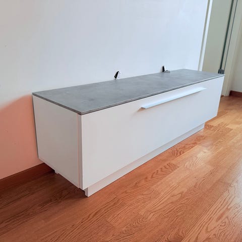 Superfin tv möbel i svart metall och glasdörrar från Mio. Glashyllor.