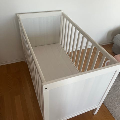 Säljer en vit IKEA Sundvik spjälsäng i fint begagnat skick.