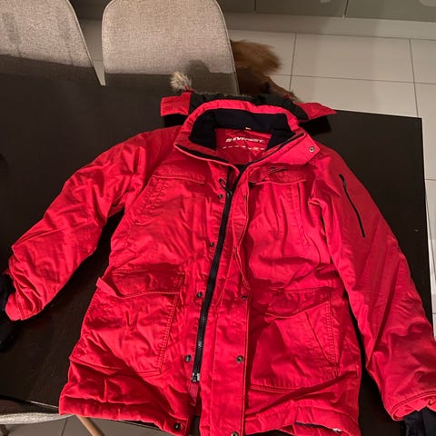 Reima barnjacka i storlek 140, röd färg, lätt glansig, och tillverkad i polyester. "Vattentålig" varm vinterjacka, Reimas premium linje. Jackan är unisex och passar barn. Den har en avtagbar huva och flera fickor fram. Jackan är vadderad och lämplig för kallare väder. Bästa jackan, använt av ett barn. Finns synliga spår av användning men är i fint använt skick och har många år kvar att ge.
