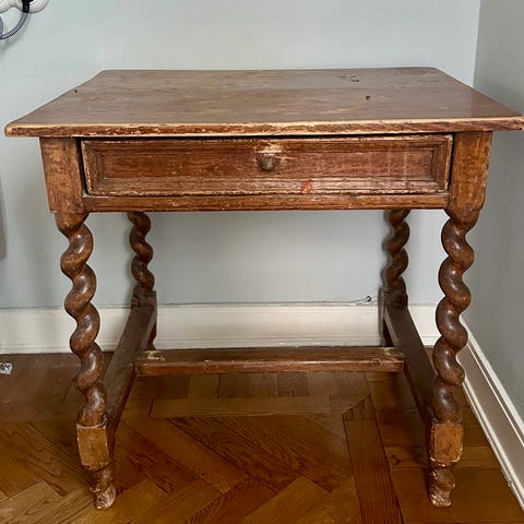 Antikt litet bord tillverkat i trä med en rektangulär bordsskiva och en låda under för förvaring.