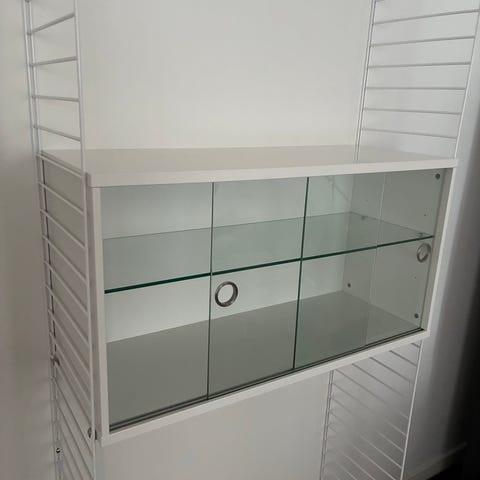 Har ett vitt String-vitrinskåp som blivit stående i förrådet alldeles för länge, så nu är det dags att det kommer till användning istället.