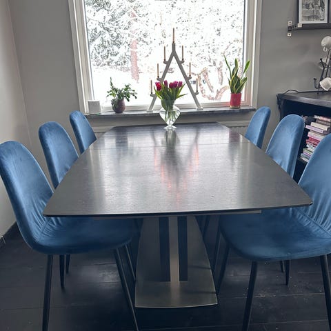 Snyggt, stilrent och gediget matbord Occa från Boconcept med 6 platser. Iläggsskiva finns för att förlänga bordet till 263 cm vilket gör det perfekt för större sällskap, så skönt att slippa bordsben på sidorna.