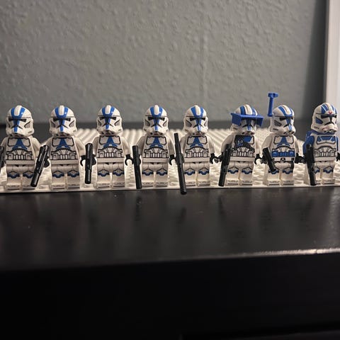 LEGO Star Wars minifigurer inklusive två figurer med ljussablar på en svart basplatta. Figuren till vänster har en mörk blå huva och grön ljussabel, figuren till höger har svart hjälm och blå ljussabel.